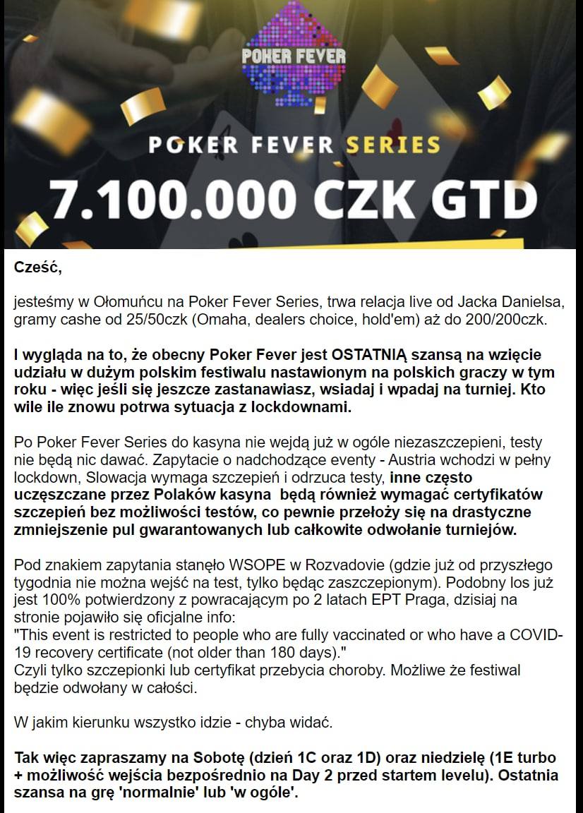 Zaczniemy dzisiejszy raport trochę nietypowo, od ważnej informacji, którą opublikowali w mediach społecznościowych organizatorzy festiwali Poker Fever. Oświadczenie, które w jest również zachętą do gry, związane jest z zaostrzeniem obostrzeń covidowych, które zostaną wprowadzone na terenie Czech już po zakończeniu bieżącego festiwalu.