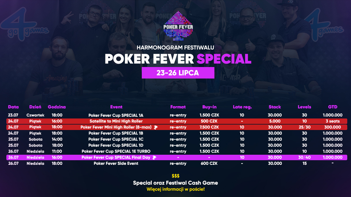 Festiwal Poker Fever Special rozpocznie się w czwartek, 23 lipca. Wtedy to rozegrany będzie pierwszy z pięciu dni startowych Main Eventu. Najważniejszy turniej ma wpisowe w wysokości 1.500 CZK i pulę gwarantowaną wynoszącą 1.000.000 CZK.