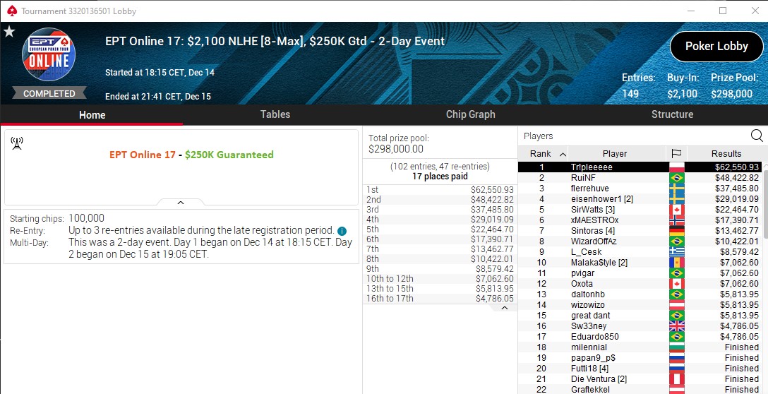 Niesamowity Tr!pleeeee zwycięża w 17. evencie EPT Online: $2,100 NLHE [8-Max]. Wysoką wygraną może również pochwalić się grigorg77.