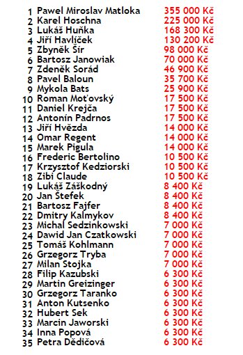 Pokertour Praga. Ostatni w tym roku i przedostatni z zaliczanych do punktacji w tegorocznej edycji turniejów Pokertour, padł łupem Polaka – Pawła Matłoki. Pokonał on stawkę 376 pokerzystów i zgarnął dzięki temu 355.000CK!
