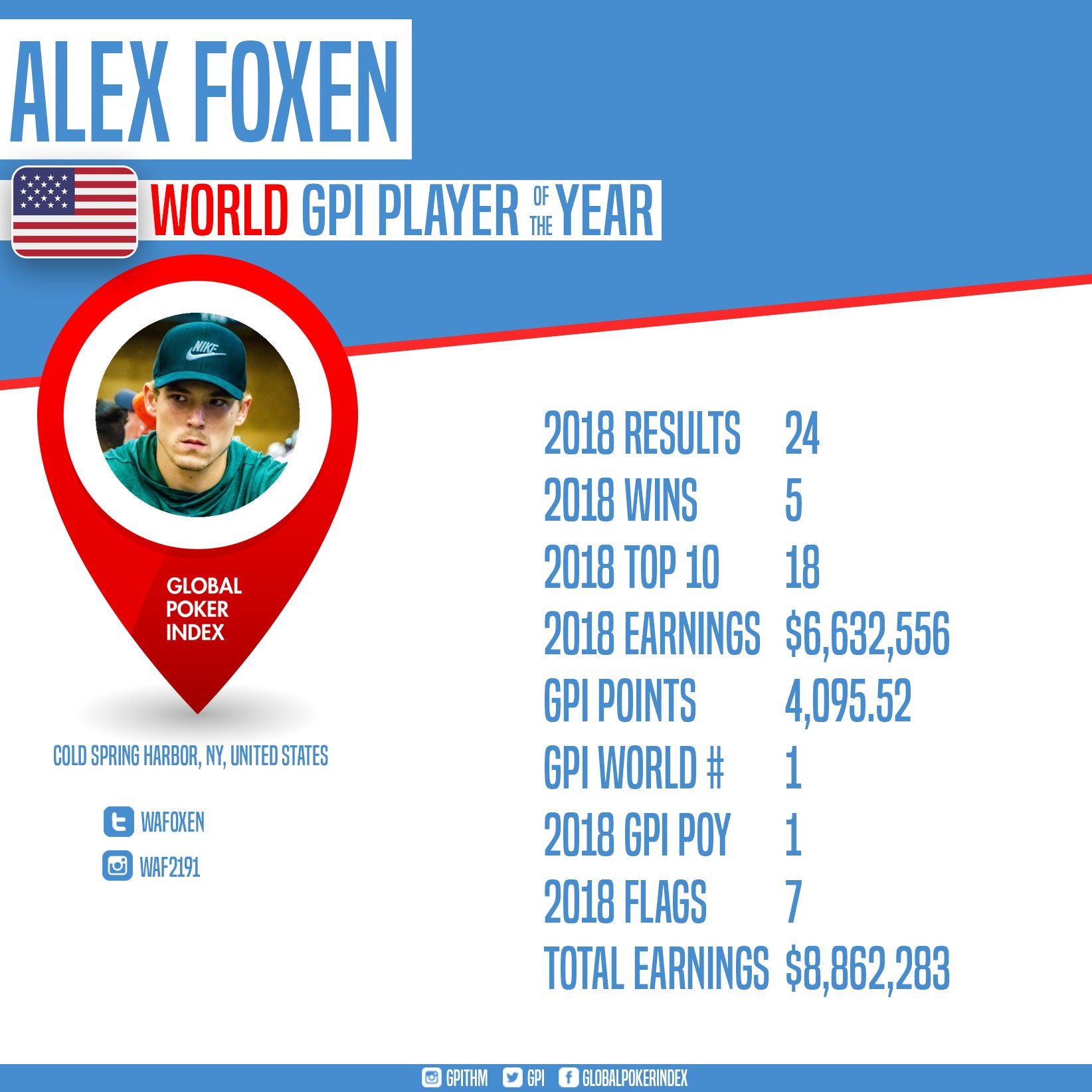 Cofnijmy się do 2018 roku. Po dwunastu miesiącach walki o tytuł Global Poker Index Player of The Year (GPI POY) zwycięzcą został William Alex Foxen. Od momentu zmiany algorytmu zliczającego punkty Amerykanin został pierwszym w historii pokerzystą, któremu udało się złamać barierę 4K i zakończyć rok wynikiem 4.095,52 punktów i przychodem w wysokości 6.632.556$.