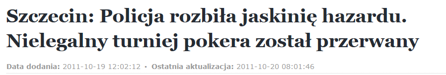 Ów wydarzenie miało swoje miejsce prawie 3 lata temu w jednej ze szczecińskich restauracji, w której Ireneusz G. zorganizował swoje 50 urodziny zapraszając na uroczystość  blisko stu znajomych. Nikt z obecnych na Sali nie spodziewał się, że weźmie udział w akcji rodem z najlepszego filmu sensacyjnego, bowiem uzbrojonych w żetony pokerzystów potraktowano jak groźnych bandytów, a do ich zatrzymania przyczyniła się liczna grupa funkcjonariuszy policji, straży celnej oraz Centralnego Biura Śledczego. Wynik przeprowadzonej akcji jest imponujący, zatrzymano aż 83 podejrzanych, co w policyjnych statystykach robi niemałe wrażenie. Szkoda tylko, że te statystyki trzeba sztucznie podnosić. Akcję policji, jak w dobry filmie akcji, oczywiście uwieczniono na nośnikach cyfrowych, żeby pokazać mężność stróżów prawa i lakoniczne próby obrony słusznie winnych zawodników…Link do archiwalnego materiału TUTAJ. Trzeba przyznać, że lokowanie produktu niezłe, ale nie wiem czy firma Paradise Poker była z tego zbyt zadowolona :)