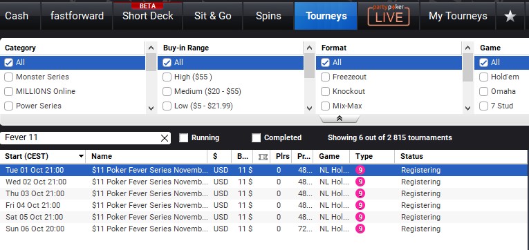 Aby znaleźć satelitę w lobby turniejowym, nastawcie wszystkie filtry w pozycji „ALL”, a następnie wpiszcie w wyszukiwarkę hasło „Fever 11”.