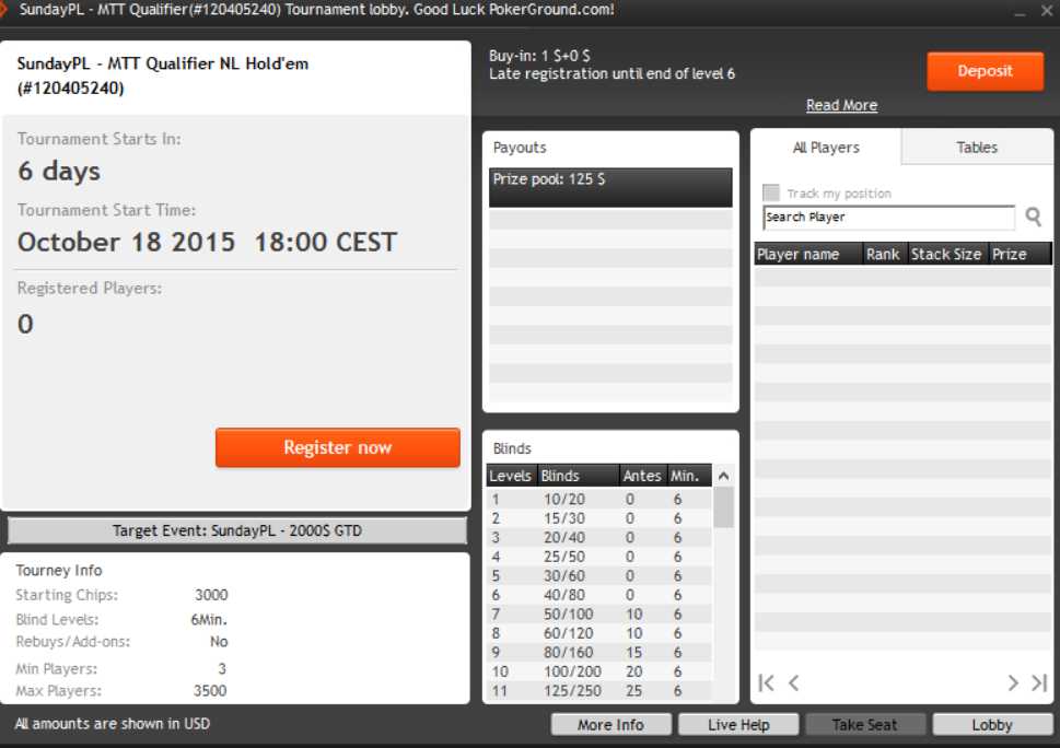 Na początek: co niedzielę rozgrywane będą dwa turnieje główne oraz jedna satelita kwalifikacyjna! Satelita do turnieju głównego SundayPL z 2000$ gwarantowanymi będzie startować o godzinie 18:00. Wpisowe wynosić będzie raptem 1$ (turniej bez możliwości rebuy oraz add-on), a struktura turnieje to turbo (6 minutowe poziomy). Za każde $5 w puli rozdany będzie jeden bilet do turnieju głównego, a 25 biletów jest gwarantowanych!