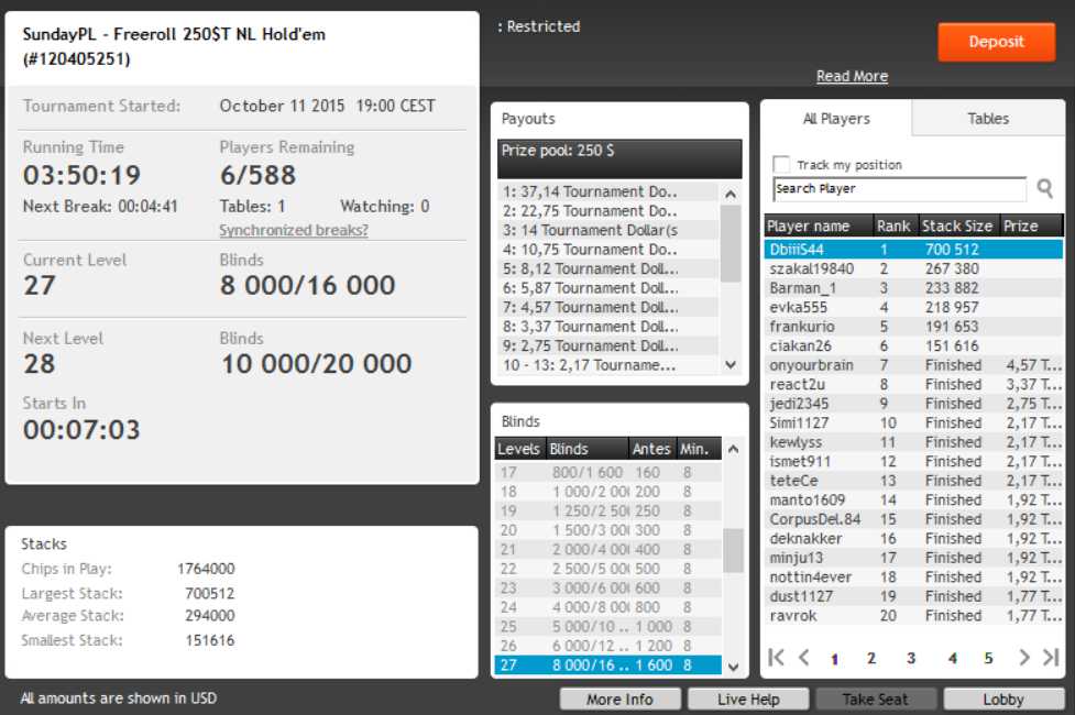 We Freerollu 250$T liczba graczy wyniosła łącznie 588, a turniej zakończył się po 4 godzinach, gdy na stole finałowym pozostało 6 graczy walczących o $37,16