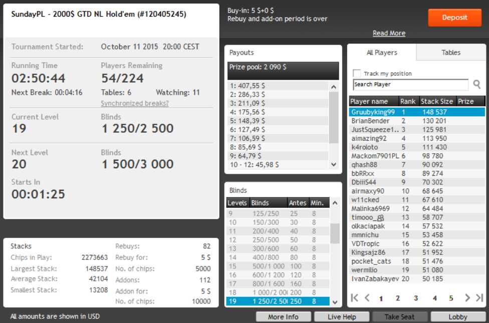 O 20:00 wystartuje natomiast główny turniej i największa atrakcja wieczoru – będzie to turniej za 5$ z aż $2000 gwarantowanymi (czyli PartyPoker kolejny raz podniosło tę kwotę!) W czasie trwania turnieju będzie można wziąć ponadto jednego rebuya oraz add-on (obie opcje nie są obowiązkowe), których koszt także wyniesie 5$.
