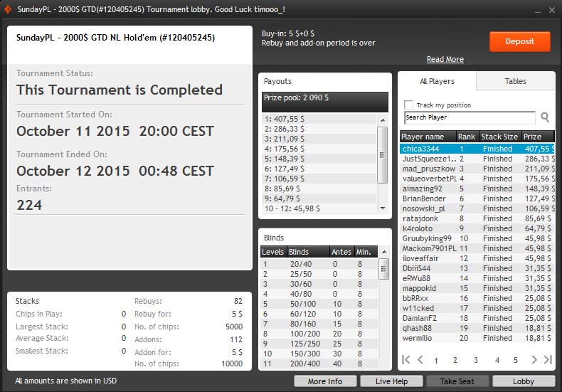 Finalnie cały turniej po prawie pięciu godzinach walki na wirtualnych stołach zwyciężył gracz ”Chica3344” czym również powiększył swój bankroll o $407,55 Gratulujemy!:)