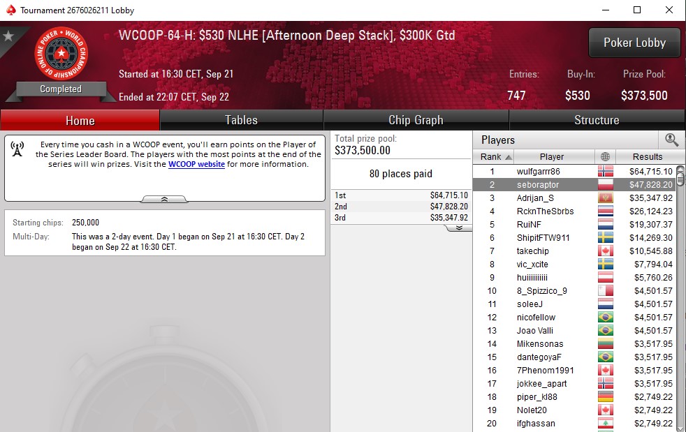 Aj, jak blisko było kolejnego mistrzowskiego tytułu dla gracza z Polski. Szkoda, że seboraptorowi nie udało się postawić kropki nad i w heads-upie eventu 64-H, ale z finansowego punktu widzenia domknięcie było pełne. Polak swoje 530$ wpisowego zamienił na 47.828$. Gratulujemy kapitalnego wyniku.