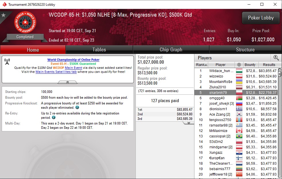 WCOOP-65-H: 1.050$ NLHE, 500K GTD