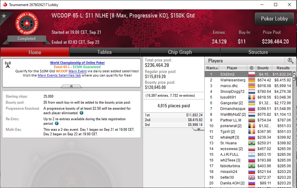 To, co nie udało się w evencie 64-H, udało się domknąć w evencie 65-L. Chwilę po drugiej w nocy na najwyższym stopniu podium biało-czerwoną flagę zatknął S3d3m2. On dopiero wykręcił kosmiczne ROI – zainwestował zaledwie 11$, a odszedł od stołu bogatszy o 15.990$. Doskonała robota!