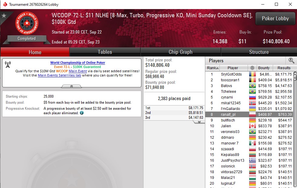 Kolejnym bohaterem dzisiejszego dnia został ranalf_pl, który może nie zarobił pieniędzy zmieniających życie, ale pokazał się na stole finałowym eventu 72-L i za to należą mu się wyrazy uznania. Przyjemne 1.172$ zasiliły jego konto. Tak trzymać!