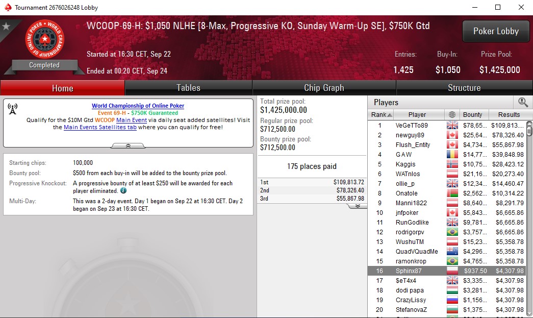 Sphinx87 właściwie tylko „odbił kartę na semi-FT” eventu 69-H i niestety chwilę później musiał wstać od stołu. Finansowo skończyło się całkiem przyjemnie – 5.245$ zasiliło jego konto.
