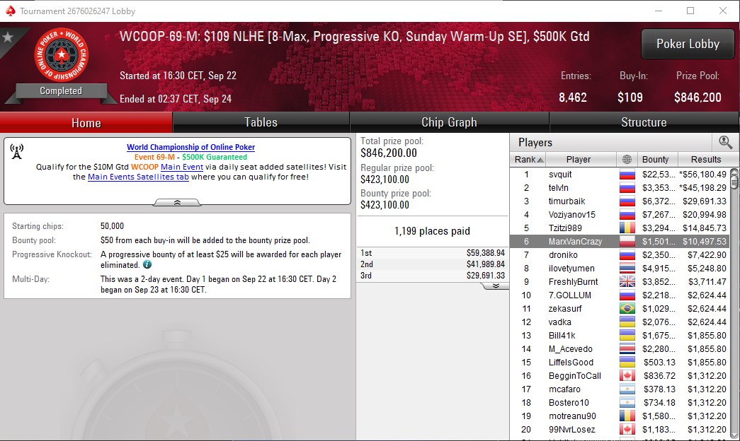 Przedostatni raport WCOOP rozpoczynamy od wizyty na finałowym stole eventu 69-M gracza kryjącego się pod nickiem MarxVanCrazy. Wprawdzie impreza skończyła się trochę przedwcześnie – Polak zajął szóste miejsce – jednak podejrzewamy, że nasz gracz wstał od stołu i tak w szampańskim nastroju, gdyż na jego konto wpłynęło 11.999$.