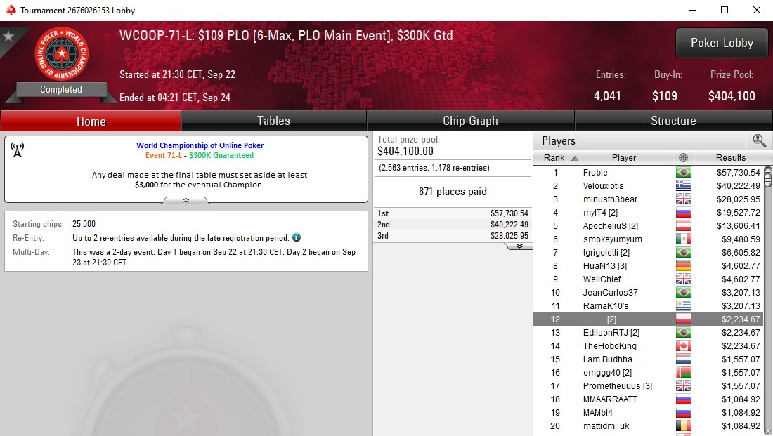 W evencie 71-L na semi-FT dotarł jeden z Polaków – ten gracz woli pozostać anonimowy – który dzięki zajęciu 12. miejsca zgarnął 2.235$.