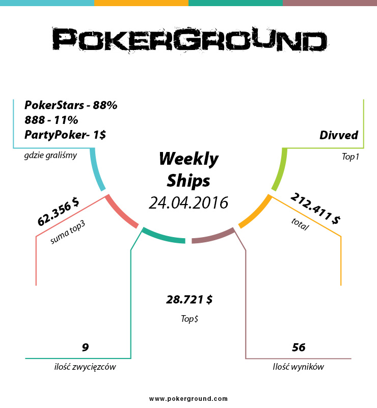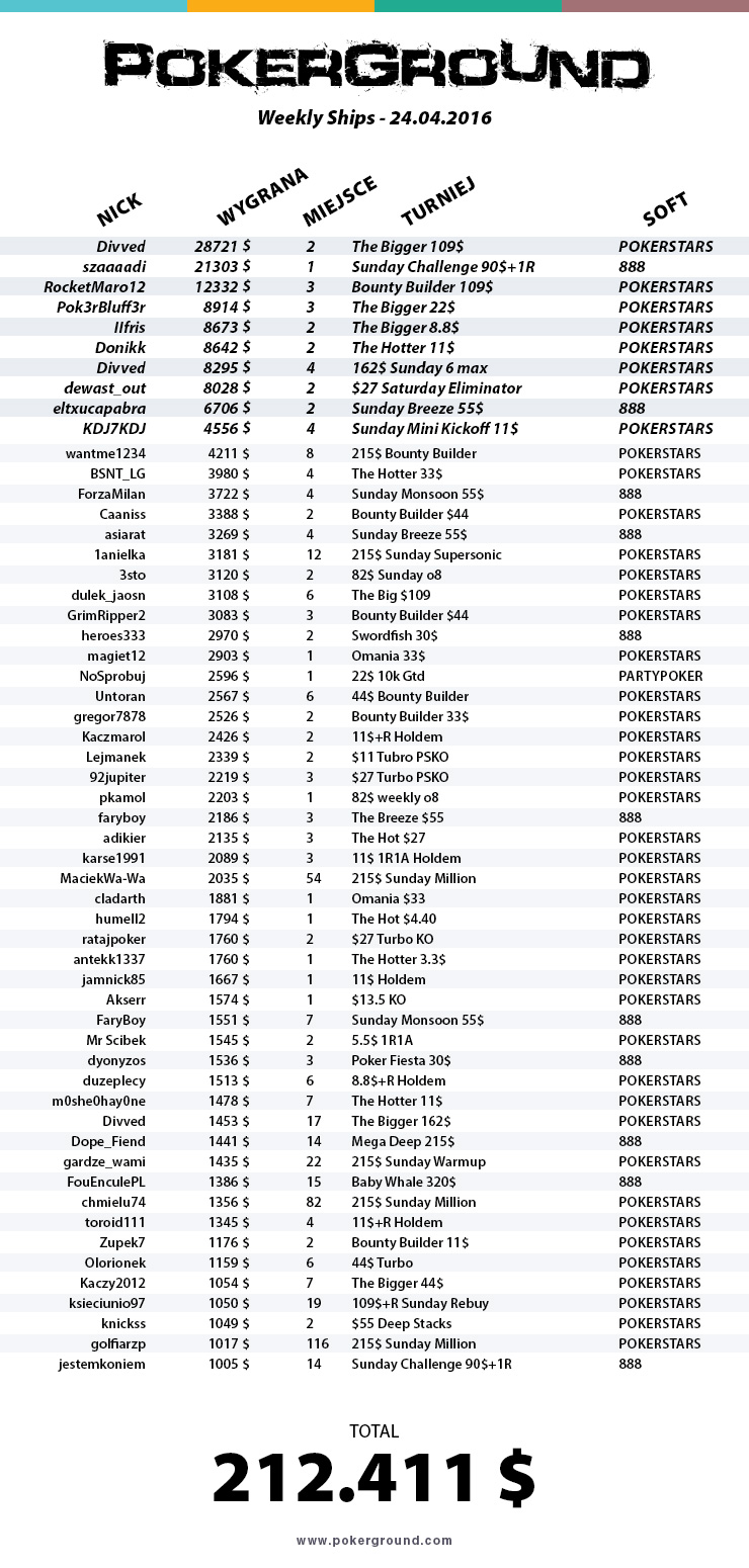 Za nami kolejny weekend, tym razem trzeba przyznać, że nasi rodacy spisali sie rewelacyjnie. Wyjątkowym w tej sytuacji jest to, iż bardzo dużo wyników pochodzi z platformy 888poker, więc widać już tendencję do przechodzenia graczy na inne softy niż Poker Stars. Jednakże jak to najczęściej bywa najlepszy wynik pochodzi z turnieju The Bigger 109$ a należy do gracza Divved. Drugi wynik już pochodzi z platformy o której wcześniej wspomnieliśmy a należy do Szaaaadi i jego świetnego wyniku w Sunday Challenge 90$. Ostatnie miejsce na podium to RocketMaro12 i turniej z podobnym wpisowym do dwójki pozostałych a dokładnie Bounty Builder 109$.