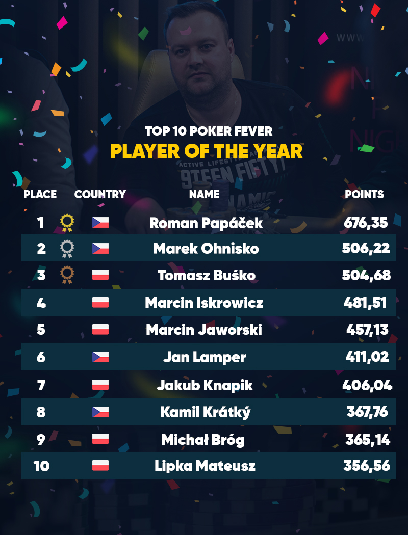 Na trzecim miejscu mamy pierwszego Polaka w klasyfikacji, którym jest Tomasz Buśko. Stały bywalec eventów Poker Fever zdobył ponad 100 punktów w trakcie grudniowego przystanku Poker Fever CUP i dzięki temu zakończył sezon na najniższym miejscu na podium.