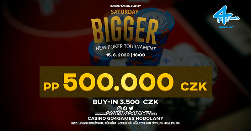 Jednym z najbardziej interesujących wydarzeń miesiąca, które odbędzie się w Go4Games 15 sierpnia, jest turniej Saturday Bigger. Po opłaceniu wpisowego w kwocie 3.500 CZK otrzymacie bilet wstępu do gry o przynajmniej 500.000 CZK.
