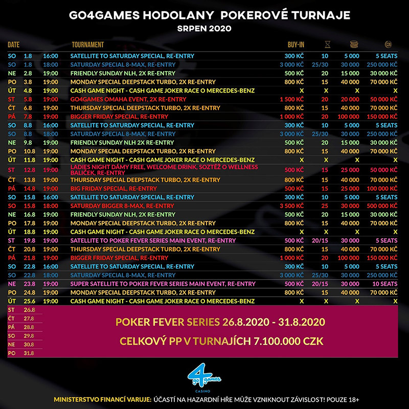Jeśli jescze nigdy nie próbowaliście gry w Go4Games Casino Hodolany, sierpień jest doskonałym miesiącem, aby to zrobić. W kasynie Hodolany znajdziecie różnorodną ofertę turniejową i cashową, która zadowoli graczy zawodowych i rekreacyjnych.