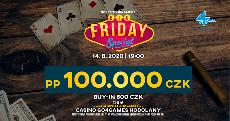 Entuzjastów pokera jeszcze bardziej powinien zainteresować event Big Friday Special, który odbędzie się w kasynie Go4Games 14 sierpnia. Za jedyne 500 CZK zagracie w nim o gwarantowane 100.000 CZK; próg gwarancji obliczony jest na 200 wejść.