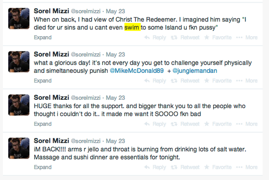 Około dwóch tygodni temu super gwiazda pokera Sorel Mizzi ogłosił za pośrednictwem Twittera, że podejmuje się zakładu polegającego na przepłynięciu z plaży Ipanema w Rio de Janeiro do wyspy oddalonej o około 5 kilometrów. Zakład wymagający i szalony, nic więc dziwnego, że nikt nie dawał pokerzyście większych szans na jego wygranie. Oddsy zakładu wynosiły 3 do 1.