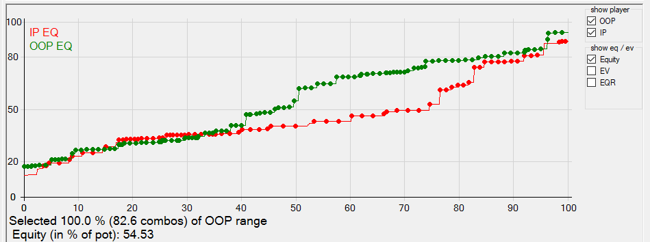 Spójrzmy najpierw na rozkład equity. Jak widzimy, w obszarze nutsów oba zakresy dość mocno się pokrywają, stąd też nie chcemy tutaj grać dużymi sizingami. Za to w obszarze między 40% a 80% equity mamy dużą przewagę, stąd też możemy pozwolić sobie na częste betowanie, przy użyciu małego sizingu.
