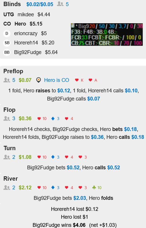 Hero otwiera z CO z . Jego zagranie zostaje sprawdzone przez obu graczy z blindów. Spada flop: .