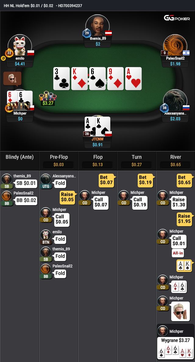 , nie chcemy czekać nie tylko z AK, ale z żadnym asem. Po naszym uderzeniu i przebiciu musimy sobie odpowiedzieć, jaka jest relatywna siła naszego układu. W ujęciu absolutnym są to dwie top pary, tak więc układ z tych mocniejszych. Patrząc w ujęciu bardziej relatywnym, jest to ręka „drugiej kategorii”, bardzo dobra, ale nie „nieśmiertelna”. Dlatego zdecydowanie polecam tylko sprawdzenie. Nic dodać, nic ująć.