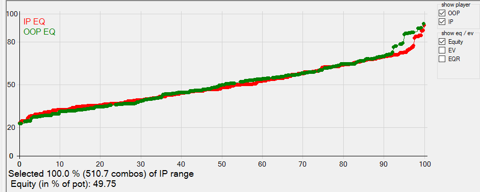 Jak widać na poniższym obrazku, żaden z graczy nie ma znaczącej przewagi zakresu, ale już w kwestii nutsów na niewielkie prowadzenie wysuwa się gracz będący bez pozycji Z tego wynika ogólna strategia gry na flopie: czekamy dużo, betujemy rzadko, a jeśli już betujemy, to robimy to średnim sizingiem.