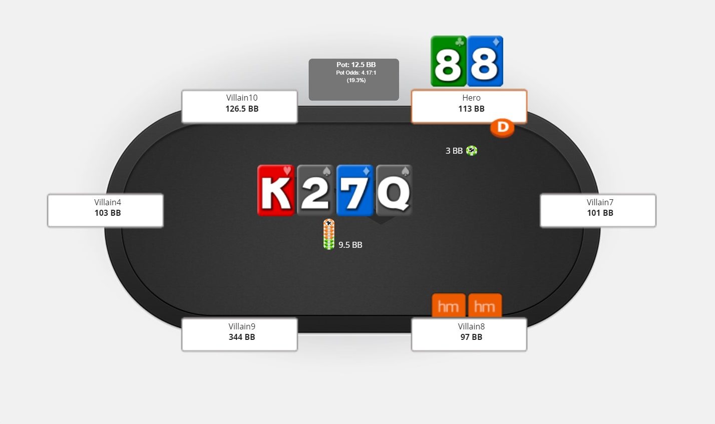 Biorąc pod uwagę, jak często ósemki są na prowadzeniu, mamy obowiązek zatroszczyć się o ochronę naszej ręki. Oczywiście nie chcecie grać tutaj wysokim sizingiem, bo odbijecie się jedynie od pary króli, a pewnie i sprawdzi Was też każda dama, ale Wasze potrzeby: ochrona equity i light value dobrze zaspokoi kolejny bet za 1/3 puli.