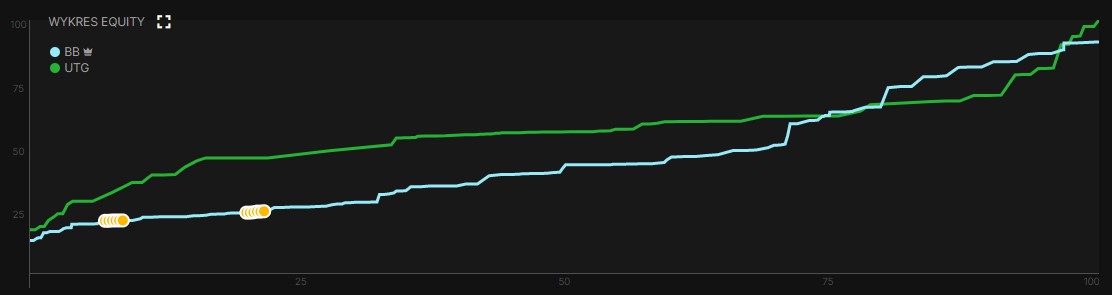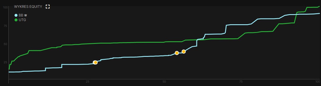 Spójrzmy na wykres EQ, który pokazuje nam GTO Wizard. Przez większość drogi znaczną przewagę ma zakres gracza z UTG. HERO ma przewagę w grupie rąk z equity 65%-88%, a później, a w absolutnej topce znowu wypada gorzej. Warto przy tym zauważyć, że program pokazuje, że jedynym posiadaczem fulla dziesiątek może być tylko gracz UTG, z czym się zgadzam. Jednak już mniej zgadzam się z tym, że karetę dwójek będzie miał gracz z UTG. Osobiście w standardowych okolicznościach nie polecam otwierania pary 22 z pierwszej pozycji, a raczej 44+.