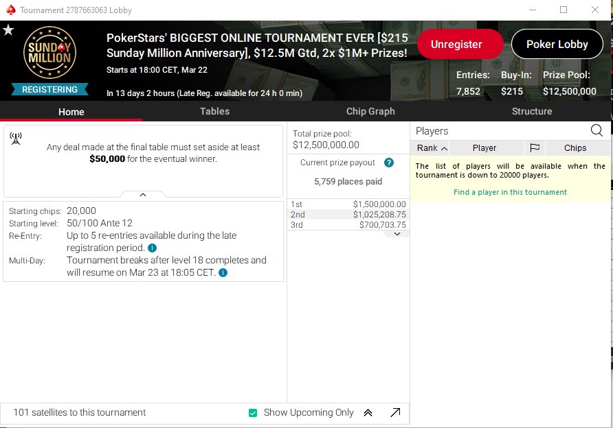 Już 22 marca na PokerStars rozpocznie się największy turniej w historii tej platformy. Gdy mówimy największy, mamy wydarzenie z największą pulą gwarantowaną, w której znajdzie się aż 12.500.000$. Czy na ten event powinniśmy mieć jakąś inną strategię niż zwykle?