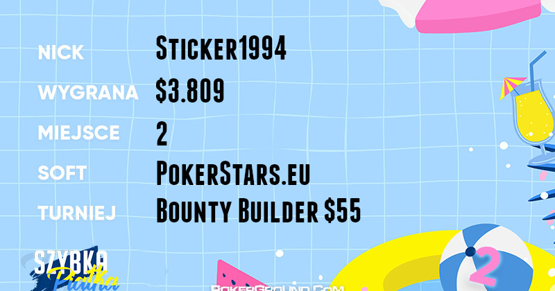 Również jako runner-up zameldował się Sticker1994, autor drugiego najlepszego wyniku. Akcja działa się w turnieju Bounty Builder $55, gdzie nasz gracz zainkasował za swój wyczyn $3.809.