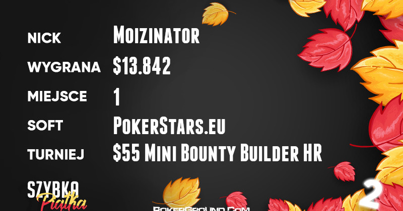Z kolei w regularnych turniejach najlepiej spisał się Moizinator. Nie dał on rywalom żadnych szans w rozgrywce $55 Mini Bounty Builder HR, a w efekcie zawdzięcza sobie przyzwoitą wypłatę w kwocie $13.842.