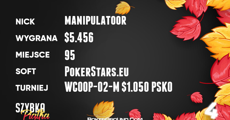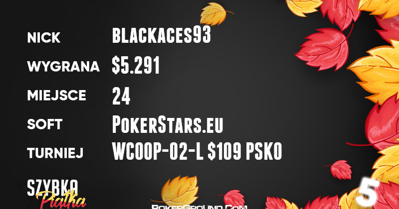 Na żółty plastron lidera mocno zapracował spajdi_xxx, który dotarł na finałowy stół rozgrywki WCOOP-08-H: $1.050, gdzie ostatecznie zajął piąte miejsce. Dzięki temu wyczynowi konto naszego gracza powiększyło się o $18.709.