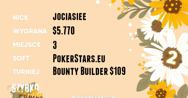 Drugi najlepszy rezultat „dwudniówki” wykręcił jociasiee. On z kolei toczył ciężkie boje w turnieju Bounty Builder $109, gdzie ostatecznie stanął na najniższym stopniu podium. Jego bankroll powiększył się o $5.770.
