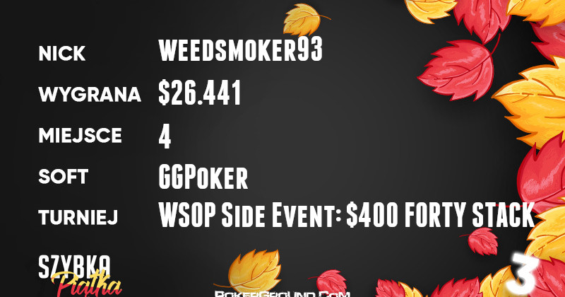 Polacy nie zwalniają tempa również na platformie GGPoker, a w największym gazie zdaje się być weedsmoker93. Wczoraj gościł u nas jako wicelider rankingu, dziś zajął miejsce trzecie. Jest to efekt występu w rozgrywce WSOP Side Event: $400 FORTY STACK, gdzie za czwarte miejsce zgarnął $26.441.