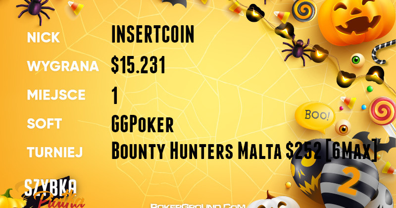 Zwycięstwem i pięcioma cyframi na koncie może pochwalić się także wicelider INSERTC0IN. Nie dał on rywalom żadnych szans w turnieju Bounty Hunters Malta $252 [6Max], dzięki czemu odebrał z kasy $15.231.
