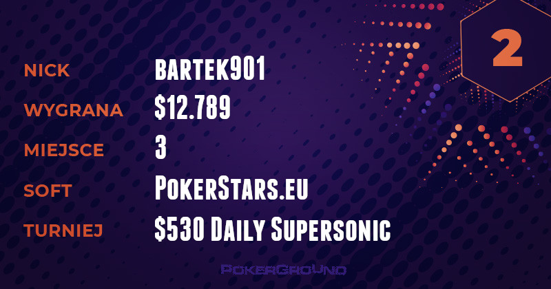 Pięć cyfr dopisał do konta również inny znany i lubiany bartek901. Stanął on na najniższym stopniu podium w rozgrywce $530 Daily Supersonic. Dzięki temu, do jego portfela wpadło $12.789.