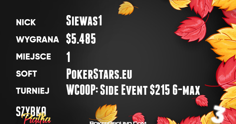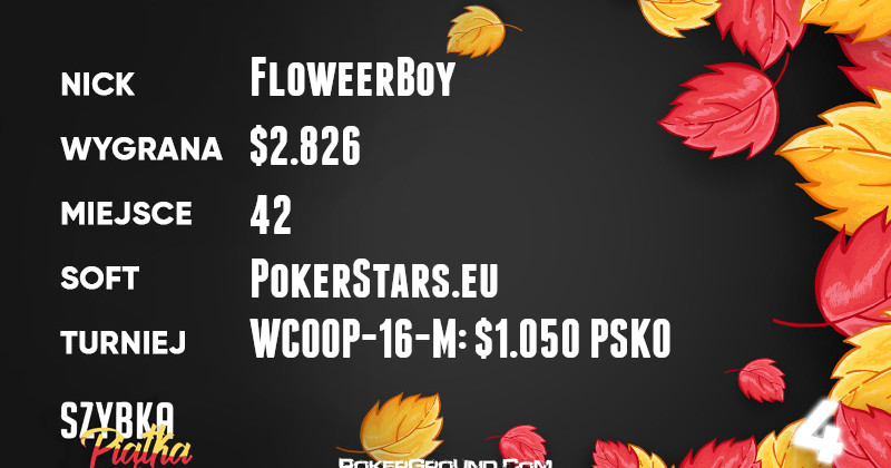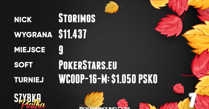 Dziś w rankingu mamy tylko jedną pięciocyfrową kwotę, a jej autorem jest dobrze znany szerszemu gronu Storimos. Dzielnie poczynał sobie w dwudniowym evencie WCOOP-16-M: $1.050 PSKO. Ostatecznie zakończył udział na miejscu dziewiątym i zainkasował $11.437.
