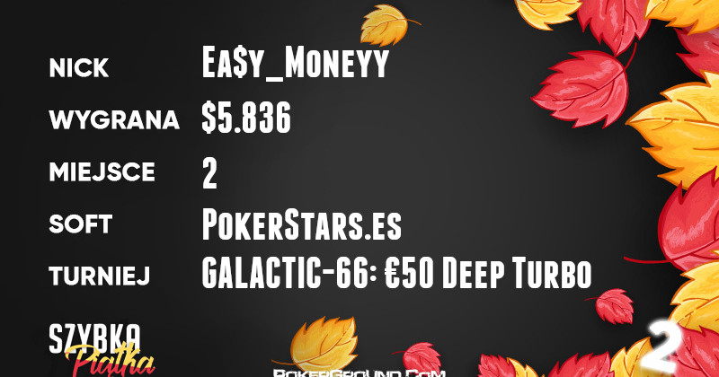 Nieco w cieniu dwóch wielkich festiwali, na platformie PokerStars.es dzieje się zabawa pt. GALACTIC. W evencie #66: €50 Deep Turbo na drugim miejscu zameldował się Ea$y_Moneyy. Za swój wyczyn otrzymał wypłatę w kwocie $5.836.