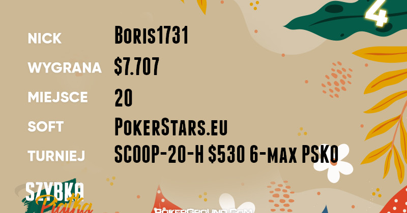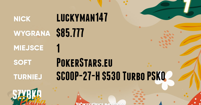 Nieco ponad pięć godzin potrzebował lucykman147, aby rozprawić się z konkurencją w evencie SCOOP-27-H $530 Turbo PSKO. Oprócz otrzymania insygniów zwycięzcy, jego konto powiększyło się o imponujące $85.777.