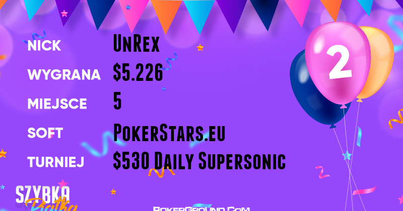 Za liderem uplasował się UnRex, który dotarł na finałowy stół turnieju $530 Daily Supersonic. Ostatecznie nasz gracz zakoczył swój udział na miejscu piątym, za co otrzymał $5.226.