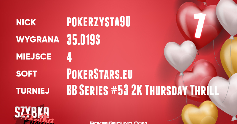 Kapitalna passa trwa. Wczoraj pokerzysta90 triumfował w evencie #41 Bounty Builder Series, i oczywiście w Szybkiej Piątce, a na jego koncie z tego tytułu zaksięgowano ponad 46.000$. Dziś sytuacja się powtórzyła, a przynajmniej w wymiarze finansowym. Wprawdzie Polak zajął w evencie BB Series #53 miejsce tuż za podium, ale z racji podwyższonego wpisowego i tak udało mu się zgarnąć 35.000$ i kolejne pole position w naszym codziennym zestawieniu. Coś nieprawdopodobnego!
