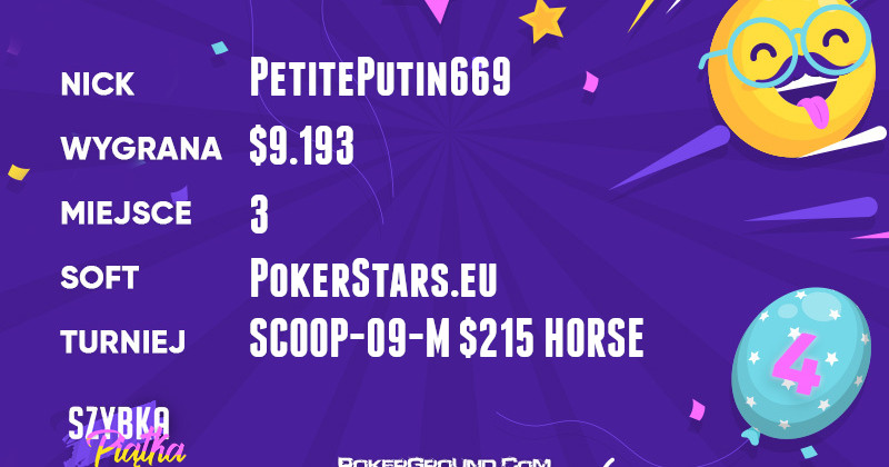 Najbliżej triumfu w eventach SCOOP 2021 był z kolei PetitePutin669. Bardzo przyzwoicie radził sobie w rozgrywce SCOOP-09-M $215 HORSE, gdzie ostatecznie stanął na najniższym stopniu podium. W nagrodę odebrał kwotę w wysokości $9.193.