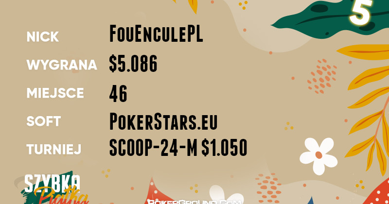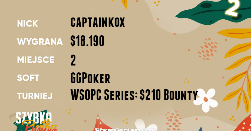 Przyjemne pięć cyfr do bankrolla dopisał również captainkox. Dzielnie poczynał sobie w turnieju WSOPC Series: $210 Bounty, gdzie dotarł do finałowego pojedynku. Tam musiał uznać wyższość rywala, a za swój wyczyn zainkasował $18.190.
