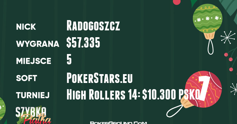Dwa dni toczył Radogoszcz boje w evencie High Rollers 14: $10.300 PSKO. Dotarł do lokat płatnych, co już samo w sobie było nie lada wyczynem, ostatecznie kończąc udział na miejscu piątym. W efekcie, otrzymał z kasy turnieju $57.335.