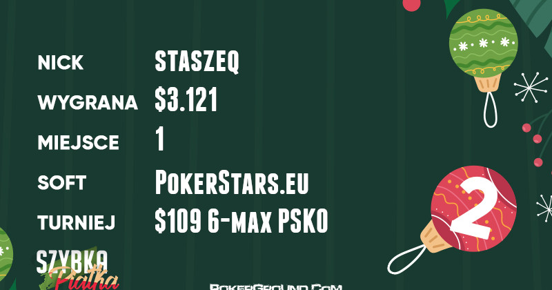 Ze swojego boju zwycięsko wyszedł wicelider rankingu staszeq. Gracz stajni Smart Spin MTT nie miał sobie równych w rozgrywce $109 6-max PSKO. Do swojego bankrolla dopisał $3.121.