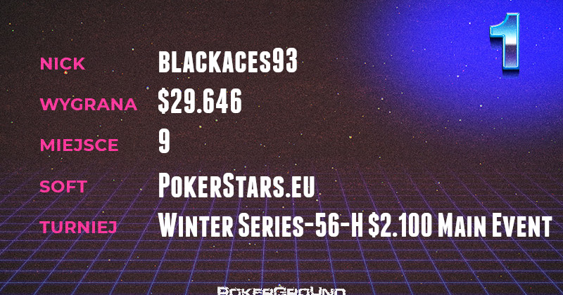 Najdłużej w festiwalowych bojach wytrwał blackaces93, który dzielnie trzymał się w Main Evencie Winter Series #56-H $2.100. Ostatecznie zakończył swój udział na miejscu dziewiątym. Wysokość wypłaty wyniosła $29.646.