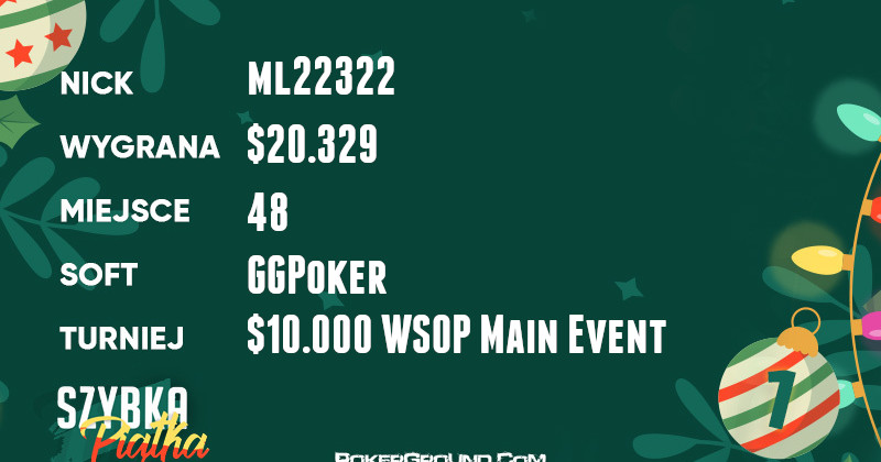 Wynik dnia to efekt zmagań ostatniego naszego reprezentant w turnieju $10.000 WSOP Main Event na GG Poker. Gracz o nicku ml22322 zakończył swoją wędrówkę na miejscu 48, a to pozwoliło na dopisanie do bankrolla $20.329.