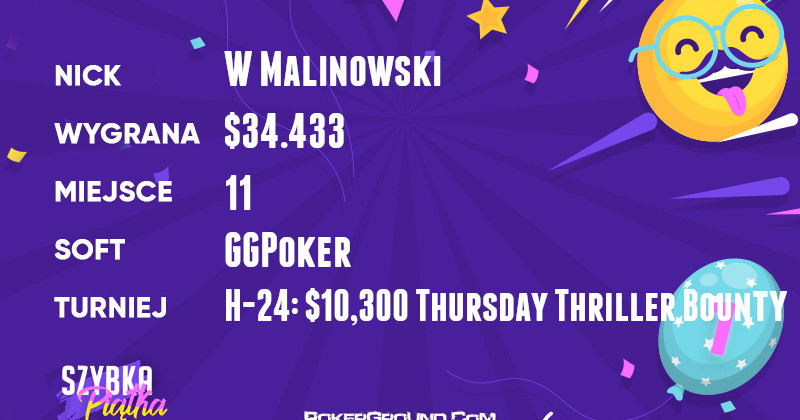 Znów w rankingu rządzi i dzieli W Malinowski, który zameldował się na miejscach płatnych w dwóch „grubasach” na GGPoker. Jedenaste miejsce w H-24: $10.300 Thursday Thriller Bounty oraz ósme w M-23: $2.625 High Roller zapewniły w efekcie dochód przekraczający łącznie pięćdziesiąt tysięcy dolarów.